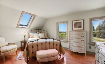 The third bedroom has a queen-size bed, bedside table with lamp, 2 large dressers and a lounge chair to relax in while you think of all the day’s adventures. This room has an ocean view, which is almost birds-eye from its lofty vantage point. It’s perfect for catching the tidal activity below, and seeing how Maine fishermen prep for their day in the nearby fishermen’s shack.