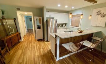 A refreshing blend of midcentury and 21st modern, this perfectly located flat possesses the charm and ease of the fabulous 50s with all the up-to-date comforts and conveniences any sojourner would appreciate. Oh my gosh, we fell in love! Awesome, efficient space, totally functional kitchen, cozy living area and inviting bedroom, pristine bathroom, plus your own washer/dryer, you have it all. It's homey but with a resort ambience of yester-year. We were transported. Wonderful, pedestrian-friendly, clean and safe neighborhood just minutes from everything, including the beach. Jeff is a very helpful, attentive host. My family really enjoyed their time here. Hate to say it 'cause it'll be booked up from here to eternity, but ... make your reservation; it's a great place!