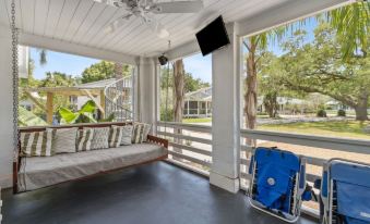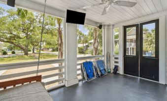 Screened Porch: Overlooking the adjacent park, the private screened-in porch offers a peaceful outdoor retreat. It features a large hanging porch bed and a TV with stereo sound, making it an ideal spot for unwinding after a day of exploring.
