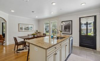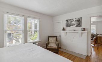 Living Area: The living room is bright and spacious, featuring comfortable seating and a 65" 4K TV with stereo sound and a subwoofer. The decor combines historic elements with modern touches. Large windows let in plenty of natural light, and the room opens onto a screened porch for seamless indoor-outdoor living.