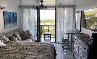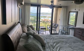 Beautiful view from balcony overlooking the beach cove. Short walk 1/4 mile downhill, and if you have a car the return uphill walk back doesn't matter. Sapphire beach is great with a bar and food. There is also a restaurant/bar on the property. Only drawback for me was the bed is a queen size and when we travel we ask for a king size or two beds. The TV was great size, but I’m not a roku customer and someone had to educate me on proper usage on my second day. Weather was beautiful