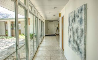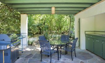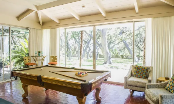 A luxurious mid-century modern home with 5,000 square feet, The Ambassador House is the main house on the estate and comfortably sleeps up to 12 persons. An additional 6 people can stay in the guest house (details below). The Ambassador House is beautifully furnished in mid-century modern and transitional style with modern artwork. The master suite includes 1 king bed, coffee bar, sitting area, walk in closet, and private bath. The other 2 bedrooms include 2 queen beds each and a Jack and Jill bath. The study accommodates two more persons on a twin size daybed and a pull out twin bed, and the study has its own full bath. The Ambassador House also includes a formal living area, a dining room with seating for 8, a fully equipped kitchen with a breakfast nook for 6, and game room with a TV, bar, and pool table. Every room in the house has sweeping views of natural oak trees and wildlife.