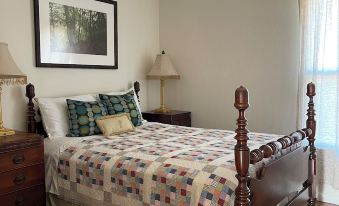 The spacious master bedroom includes a queen size bed, tv, and private full bath. The middle bedroom has a full size bed. Third bedroom has a queen size bed. The bedrooms are spacious, each with their own charm, including dressers and closets. There is a full bathroom directly across from these 2 bedrooms.