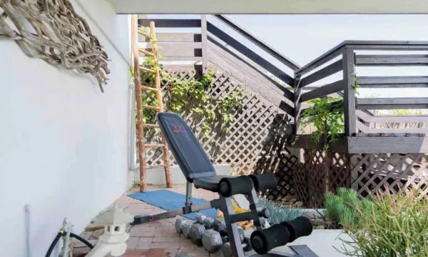With comfortable outdoor furniture, weight bench and hand weights, a barbecue area with a small sink & outdoor beverage fridge, use of the backyard area to sun yourself or enjoy lawn games, a private (locked) space for outdoor toys such as beach cruisers, surf boards or kayaks, and a breezy cool room, this location has something for everyone.
