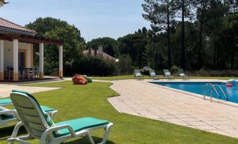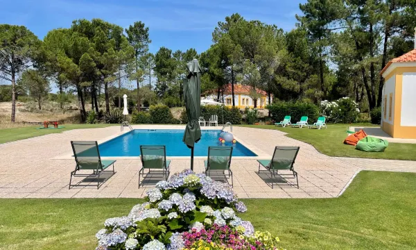 Large, luxurious "rustico" cottage "Casa dos Loendros". 102 houses in the resort. 14 km from the centre of Alcácer do Sal, 14 km from the centre of Comporta, in a secluded, quiet position, 16 km from the sea, 16 km from the beach, 1.6 km from the river, in the countryside, in the woods. For shared use: property 997 ha (fenced). Tennis (2 x hard court) (extra), basketball (extra), children's playground. Private: property (fenced), swimming pool angular (6 x 12 m, depth 110 - 190 cm, seasonal availability: 01.Jan. - 31.Dec.). Outdoor shower. In the complex: reception, restaurant, WiFi, air conditioning, washing machine. Parking on the premises. Supermarket 2 km, restaurant 2 km, bus stop 15.1 km, sandy beach "Praia da Comporta" 16 km, lake Herdade de Montalvo 50 m. Marina 31 km, golf course (18 hole) 30 km, tennis, riding stable, walking paths from the house 50 m. Nearby attractions: Comporta 16.2 km, Praia fluvial, da comporta 9.3 km, Estação Arqueológica de Abul 35.8 km, Tróia 30.1 km, Alcácer do Sal 14.4 km, Viveiro Florestal da Mata Nacional 16.8 km. Please note: car recommended. Suitable for families. Loading and unloading of baggage is possible at the holiday house. 24hr guard. "Loendros", 3-room villa 89 m2. Very cosy furnishings: living room with cable TV. 1 room with 1 french bed (160 cm, length 200 cm). 1 room with 2 beds (90 cm, length 200 cm). Kitchen (oven, dishwasher, 4 ceramic glass hob hotplates, toaster, kettle, microwave, freezer, electric coffee machine). 3 bathrooms. Upper floor: sleeping alcove with 1 double sofabed (140 cm, length 190 cm). Terrace furniture, barbecue, deck chairs. View of the swimming pool and the garden. Facilities: washing machine, iron, children's high chair, baby cot for up to 2 year olds, hair dryer. Internet (WiFi, free). Parking at the house. Please note: suitable for families. Fire extinguisher. Instead of an enclosed bedroom, some sleeping areas are located in an open-plan area (gallery, alcove, etc.). 89/AL