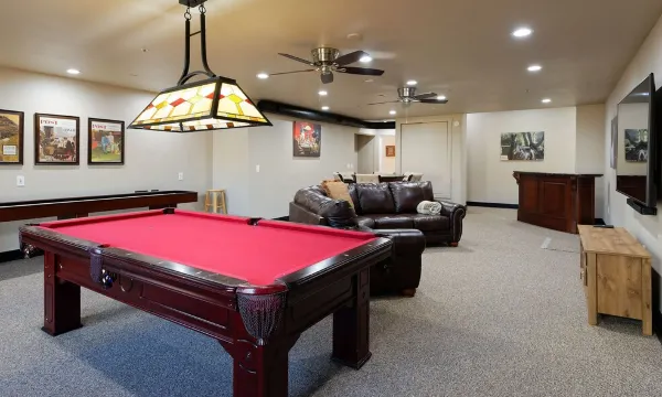The entertainment options here are endless! A large game room offers a variety of activities, complete with a pool table, board games, and a cozy media area perfect for movie nights or gaming sessions. It’s the ideal spot for fun-filled family competitions or unwinding after a day spent exploring the area. For those who prefer outdoor relaxation, the luxury swimming pool awaits, surrounded by chic lounge chairs and a sun-drenched patio. The pool area also features shaded seating areas, creating a resort-like atmosphere where everyone can recharge in style.