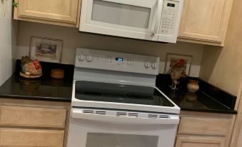 This single story end unit is flooded with natural light from big windows and sliding glass doors. This exceptional home has two bedrooms with queen, pillow-top mattresses, two full renovated bathrooms, and a den/office with day bed. It has light wood floors, a fully furnished granite kitchen, a formal dining area with chandelier, a custom-furnished living room with vaulted ceiling and a gas fireplace. .High speed internet, smart TV, DVD, washer/new electric dryer. The home is handicapped accessible.
