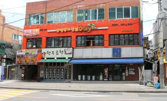 There is a CU store at GF , a billiards club on 2nd floor and Dasan is on 3rd floor. Refer pictures for guidance. You can always come downstairs and grab a quick bite at CU which is open 24x7. I found the place great for solo travellers - has pretty much everything you need - good internet, a kitchen , there are only two lockers - so , as owner for one as soon as you come, washroom is clean- toilleteries are there, they even have a top loader washing machine which the kind fellow let me use. Dont expect breakfast- there is none apart from a little snacks.