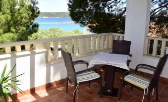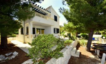 Sevid 9 km from Marina: Single-family house "Željko", 2 storeys. In a quiet, sunny position, at the seaside, on the beach. Private: property 800 m2 (fenced), swimming pool angular (7 x 3 m, depth 90 - 160 cm, seasonal availability: 01.May. - 15.Oct.) with internal staircase. WC in the pool area, outdoor shower, terrace (24 m2), garden furniture, barbecue. In the house: internet access, washing machine. Roofed, parking at the house on the premises. Shop, restaurant 500 m, bus stop 2 km, pebble beach 10 m (small), concrete beach 10 m. The house consists of 2 apartments rented as one unit. One apartment on the ground floor and one on the first floor. 4-room house 80 m2 on 2 levels. Living/dining room with 1 sofabed (140 cm, length 190 cm), satellite TV (flat screen), air conditioning. Exit to the terrace. 1 room with 1 french bed (160 cm, length 200 cm). Exit to the balcony. Open kitchen (2 ceramic glass hob hotplates, microwave, freezer, electric coffee machine). Shower/WC. Upper floor: (exterior staircase) living/dining room with 1 sofabed (140 cm, length 190 cm), satellite TV (flat screen), air conditioning. Exit to the terrace. 1 room with 1 french bed (160 cm, length 200 cm). Exit to the balcony. Open kitchen (2 ceramic glass hob hotplates, microwave, freezer, electric coffee machine). Shower/WC. 2 balconies 2 m2, terrace 10 m2, roofed, terrace 10 m2. Terrace furniture, deck chairs. View of the sea. Facilities: Internet (WiFi, free). Maximum 1 pet/ dog allowed.