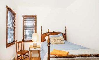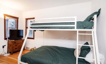 This is a wonderful lakefront house on a nine acre non- motorboat lake nestled up against the Shawangunk Mountain range. This two-level house has a beautiful open layout, and tons of light in the spacious common areas. The living room is all windows, facing out to the lake. The huge primary bedroom has en suite bathroom and the main level has two additional bedrooms, one of which has a full/twin bunk bed, the other has a lovely antique full bed. There's a deck, a patio and a private dock for fishing, swimming or boating—the house has three kayaks for guest use! The open kitchen is great for cooking and entertaining.