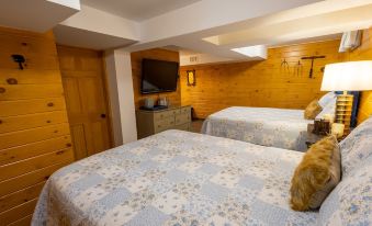 Bedroom #4 (Finished Lower Floor): Perfect for a group, this room boasts two queen beds and natural shiplap walls, providing a comfortable and welcoming environment.