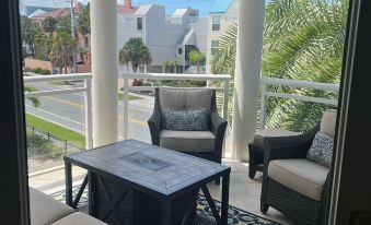 Villa is beautifully fully furnished, 2 full bedrooms and bathrooms (sleeps 4), washer, dryer, pool in backyard, 2 balconies overlooking Beach Dr and other the backyard pool. One level Villa (2nd floor), elevator, 2-car garage on ground level. Villa equipped with 4 beach chairs, umbrella, buggy, towels.