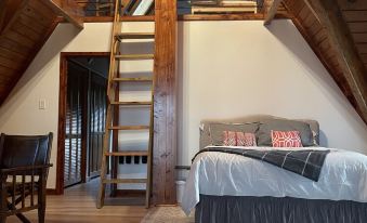 ROOMS & BEDS - 2 bedrooms and 1 full bath downstairs. Of the downstairs bedrooms, one has a king bed and the other a queen bed along with a double sofa bed. In the living room, guests will also find a queen sofa bed. Upstairs, a bedroom with a queen bed, a jacuzzi tub, a working fireplace, a full bathroom and a loft with two twin beds awaits. This upstairs suite is only accessible via spiral staircase.