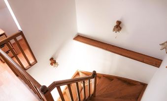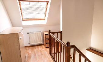 A wide wooden staircase leads to the first floor where you will find the spacious bathroom and the large bedroom with a small balcony.