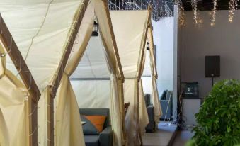 The on-site restaurant downstairs served really good food, and each table sat beneath its own cozy yurt-style canopy, which made every meal feel private and atmospheric.
