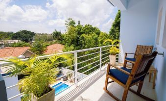All of Casa De Compai’s one bedroom condos are all constructed with the same high end materials of mahogany and granite. These condos have an open, fully outfitted kitchen. The living room has a sofa and a tv that swivels so you can watch the fiber optic tv channels or surf the web on your private high speed router. There is a dining table and chairs, and there is also a half bathroom off the living room. The bedroom is air conditioned and has a king size bed with a sealy double pillow top mattress and another tv so you can lay in bed and relax. The walk in closet has a safe and plenty of space for all your clothes and bags. There is a office space with mirror to set up a small work station. The full bathroom is on suit. each condo also has a balcony with mahogany rocking chairs.