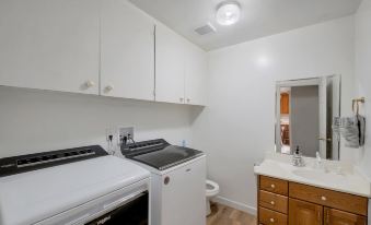 There are 3 bedrooms, one full bathroom and a laundry room combined with a half bath on the main level. One of the bedrooms comes with a queen bed, a nightstand, and a desk with chair. The other 2 bedrooms are equipped with a queen bed and 2 nightstands.