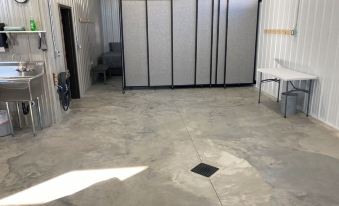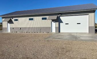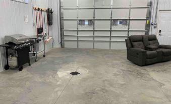 A combined 18’ by 27’ garage space with a living area, bathroom, and bedroom area with a sliding portion wall to separate from main area. Sleeping capacity is four (4) persons.
