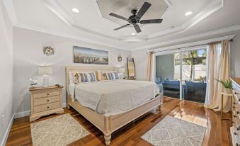 The master suite is secluded from the other bedrooms, it has a split King bed with an adjustable base and two separate remote controls, so that each person can choose their favorite sleeping/sitting position. There is even a massage option!!! There are 2 walk-in closets and a spacious master bathroom with double vanity, a soaking tub and a walk-in shower. The large sliding doors leads to the patio/pool area.