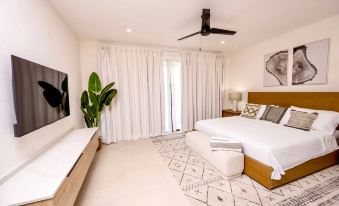 The modern European-style kitchen is equipped with quartz countertops and top-quality appliances, perfect for preparing holiday meals. The unit boasts porcelain tiles throughout, and ceiling fans in the bedrooms, living room, and patio areas ensure comfort.