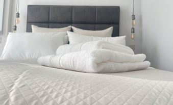 The Bedroom has a Hotel King Size bed, with linen and towels provided, fitted Wardrobe and dressing table, smart TV and heating.