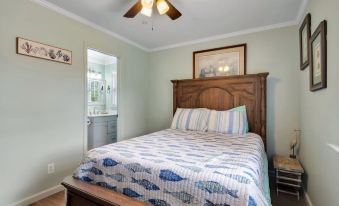 The home’s three bedrooms are thoughtfully designed for comfort: Bedroom 1: Queen bed, dresser, and a private bathroom with a walk-in shower. Bedroom 2: Queen bed with a twin bunk above, closet with dresser, and an en-suite bathroom with a walk-in shower. Bedroom 3: Charming built-in bunk beds, twin-size futon, and a half bath.