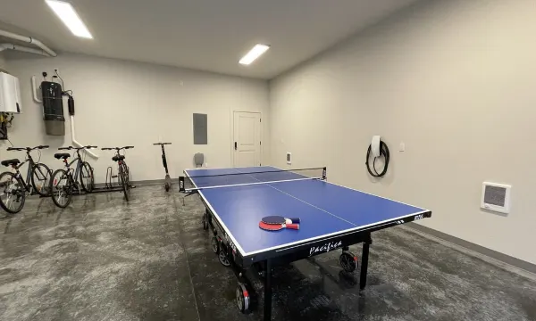 The heated garage is more than just parking—it includes a ping pong table, seven adult bikes, three kids’ bikes, and a Tesla charging station, all available for your use during your stay.