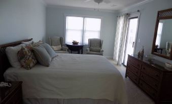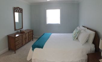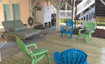 4 Bed/ 2 Bath. King Bed in Master- Queen Beds in each additional room, comfortably sleeps 8. Linens are provided to our guests. Expect to find your bed freshly made upon arrival, including 2 bath towels per guest. Wireless internet. Smart TV. Ceiling fans in each bedroom. Master Bed is spacious with a sitting area. Well appointed kitchen with dishwasher. 6 chair dining table with 4 additional seats at the breakfast bar. Gas grill. Our outdoor shower continues to be a guest favorite. Full size Washer/Dryer. The additional refrigerator/freezer located on the ground floor is perfect for extra ice for coolers and your beach beverages. Pull behind beach wagon, coolers, beach toys, beach towels and chairs are located on site. Picnic table, hammock, and additional relaxed seating under house. Rockers on covered front porch.