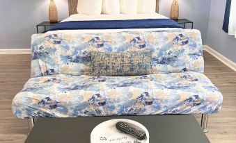 This is a fully remodeled spacious studio unit. Located upstairs, this open room features a comfortable queen bed and a futon for additional seating or sleeping space. The full bathroom includes a bathtub and comes stocked with bath towels, toilet paper, shampoo, conditioner, body wash, and hand soap for your convenience.