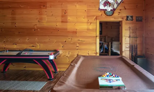 Mountain Hideaway Estate has 5 bedrooms providing plenty of space for large groups. It is perfect for a Mountain Getaway. The property features majestic Cathedral Ceilings, Great Room in living area with a beautiful Fireplace. A cozy Movie Room with the a view. Game Room includes a pool table, air hockey table, Foosball, large screen TV among many other games. Fully Equipped kitchen, and sitting area for dining accommodates your group of 12 guests. Additional seating available upon request. Located in the breezeway is a washer & dryer for your convenience. Wraparound outdoor decks with comfortable log rocking chairs and swing to enjoy coffee, tea or wine with a view! Also has a large Hot Tub Jacuzzi providing an amazing view for entertaining and enjoyment of the beautiful sunsets offered in this mountain. Includes a one car garage and parking for six vehicles.