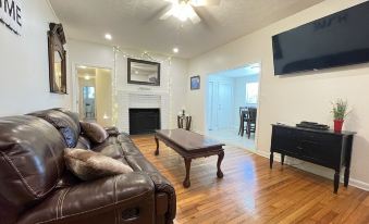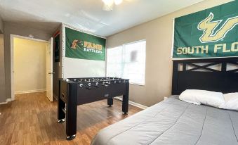 NEWLY RENOVATED IN 2025--King Suite, Awesome location near University and the Capitol, 3 Bedroom 3 Full Bath super spacious home only a mile to University, the Capitol and Cascades Park! You’ll be able to sleep up to 8-10 comfortably in beds as there are 2 bonus rooms with extra beds. We just renovated the home and relisted for August 2025. After a big day going, hang out in the family room on the huge leather couch and relax by the fireplace. Sit back and enjoy the big screen TV, or hit the Game Room for some full-size Foosball, board games like jenga, monopoly, or life. For videogame fans there is a standup video console with 300 classic arcade games. Need to get some work done while out of town? We have a full remote office with adjustable sit/standup desk, insanely fast 1Gig hi-speed internet, multi-power strip and desk light. Both Game Room and Remote Office rooms have full-size beds for additional guest space. When you’re ready for a meal, you can cook anything in our well-stocked kitchens, with every appliance you need. Both Mr.Coffee and Keurig machines. There is a bright dining area with high-top table and chairs. All bedrooms have linens and all bathrooms are well equipped with towels, washcloths and hand towels. Bedrooms are laid out as follows: #1 King Suite has King bed, en-suite full-bathroom with double sink, walk-in closet, twin mirrors, big-screen TV, and luggage racks; #2 Bedroom has King Bed, 42” TV, walk-in closet, luggage racks, and back-door entry access; #3 Bedroom has Queen bed, 42” TV, closet with luggage racks; #4 Game Room has full-sized bed, walk-in closet; #5 Remote Office has full-sized bed, walk-in closet, yoga mats, light weights. Rooms all have strong internet signal with 1Gig speed and home zone booster. Outside, you'll enjoy tailgating under our 10x10 tent with party table, game chairs, and firepit. There is parking on the property for 3 or 4 cars, and additional parking in front of house too. We'd love to have you as our guest, come stay with us-- the Broad Street house, Tallahassee, is perfect for any occasion. Come stay with us any season.About pets:Pets allowed: dogs and cats less than 50 lbs per pet (limit 2 pets total).Some larger pets allowed on a case-by-case basis..About checkOut:Check out before 10:00 AM.About children:Children allowed: ages 0-17.Pets considered case-by-case breed/weight basis.About customRules:most pets allowed however all pets considered on case-by-case basis. let owner know about breed and weight..About checkIn:Check in after 4:00 PM.About smoking:Smoking is not permitted.About minBookingAge:Minimum age to rent: 21.About events:Events allowed: family gatherings and birthday parties.Maximum event attendees: 10.