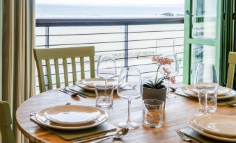 Step inside to a bright, open-plan living, dining, and kitchen area that seamlessly connects to a private balcony—your perfect spot to soak in the incredible coastal scenery. Inside, the living space features plush sofas and a smart TV, creating a cosy environment to unwind. The dining area seats four comfortably, with the option to extend to six, making mealtimes a sociable event. The well-equipped kitchen includes a double oven with microwave, hob, toaster, kettle, dishwasher, washer/dryer, and fridge/freezer—everything you need for a home-away-from-home stay.