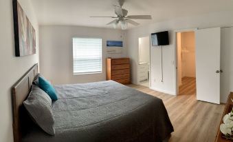 Master bedroom suite features a king-sized bed and bathroom with walk-in shower and linen closet. Walk-in closet. Wall-mounted 32” tv.