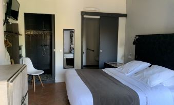 super cadre relaxant au calme chambre très jolies et modernes avec belles douches à l'italienne très bons petits déjeuners variés avec produits locaux non compris dans le prix de la chambre +15€ par personne mes observations a améliorer : pas de porte savon dans la douche planches de charcuteries ou fromages avec 1 verre de vin 32 € un peu cher par rapport à l'assiette même si produits locaux excellents... frigo non allumé lors de notre arrivée en pleine période de canicule....dommage