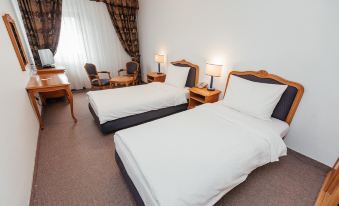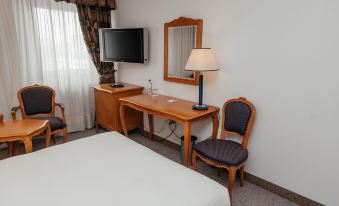 The hotel has 118 rooms with Italian furniture. The rooms are equipped with satellite TV, a work desk, a mini-bar, and a bathroom. In the hotel building: restaurants, an operational printing house, a minibus rental office, an ATM, air and railway ticket offices, a souvenir shop, a hairdresser, free unguarded parking.