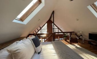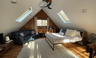 The second floor is home to your large King sized loft retreat. The open concept gives you an unobstructed view of your natural surroundings through large southwest-facing windows and skylights and to your living space below. Cozy up on the comfortable leather couch with a small table, read a book on the RH chaise lounger, or catch up on TV programs (AppleTV equipped). Unpack your things into the large antique dresser and a dedicated desk for those “only if necessary” tasks.