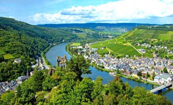 The Traben-Trarbacher Rundweg is a picturesque hiking trail in the area around the Moselle town of Traben-Trarbach in Rhineland-Palatinate, Germany. This circular route offers an ideal opportunity to experience the beautiful landscape, vineyards and historical atmosphere of this region. The path can be started from various points in Traben-Trarbach, but it often begins at the market square or the promenade along the Moselle. From here the route leads through the historic old town, where well-preserved Art Nouveau buildings can be admired. The Brückentor and the Mosel Guest Center offer interesting insights into the history and culture of the region. After exploring the city, the path leads through picturesque vineyards with spectacular views of the Moselle and the surrounding vineyards. The trail winds through forests and nature reserves, allowing hikers to enjoy the tranquility of the river. There are several viewpoints throughout the hike that offer breathtaking photo opportunities. The circular route also leads past the Traben-Trarbach thermal baths, where insights into the region's historical bathing culture can be gained. The hike ends in Traben-Trarbach, where there is an opportunity to explore the city's historical sights or enjoy local specialties and wines at a local café or restaurant. The Traben-Trarbach circular route is an ideal way to experience the natural beauty, vineyards and history of this charming Moselle town.About pets:No pets allowed.About checkOut:Check out before 10:00 AM.About children:Children allowed: ages 0-17.About checkIn:Check in after 3:00 PM.About smoking:Smoking is not permitted.About minBookingAge:Minimum age to rent: 18.About events:No events allowed.