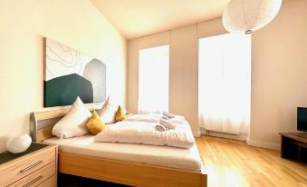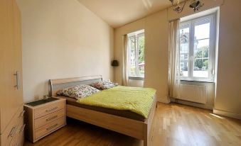 Welcome to our holiday apartment Zur Bergroute in our Mosel holiday apartments Traben-Trarbach, a former winemaker's house in the old town. The holiday apartment on the ground floor offers a cozy living and sleeping area with a modern flat-screen TV, a fully equipped kitchenette including an electric stove, microwave and refrigerator, and a dining area with a table and chairs. In the separate sleeping area you will find a comfortable double bed and a spacious closet with fresh bed linen. The modern bathroom has a walk-in shower, toilet, sink, illuminated mirror, hairdryer and hand and shower towels. Hand soap is ready for you. A flat-screen TV with satellite channels in the living area provides entertainment. Free WiFi is also available. Parking is conveniently possible on the street or public spaces. You can park your bicycles and e-bikes in the garage, charging facilities are available.