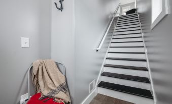 This townhome has two full baths on the third floor and a half bath on the second floor, so there is no need to worry about scrambling for shower time. The very large ensuite master bathroom features dual vanity sinks and a large walk-in shower. The second full bathroom is equipped with a shower/tub combo and the half bath does not have a tub or shower. All of our bathrooms are fully stocked with quality amenities.