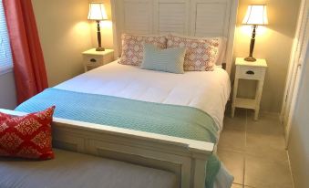 This is a ground floor unit with approximately 600 square feet of living area near the main building entrance. The center courtyard and tranquil inter-coastal backyard are just a few steps down through the breezeway. Please note, there is no water view from inside the apartment. There is one queen bed in bedroom 1, and two twin beds in bedroom 2. USB plugins for your electronics are provided in both bedrooms and the living area.
