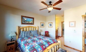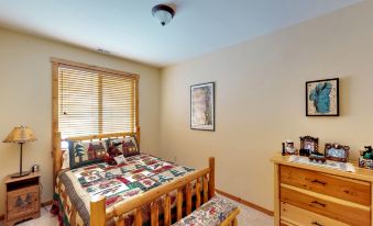 Just off the living room, guests will find the cozy primary suite furnished with rustic log furniture and offers a comfortable queen-sized bed, small TV and unique ensuite with double sinks and a separate shower room. At the other end of the home, guests have access to the shared four-piece bathroom, secondary queen bedroom and third bedroom which has fun, log bunk beds that kids will love! This space also provides a small desk and has lots of fun games perfect for entertaining kids off screens!