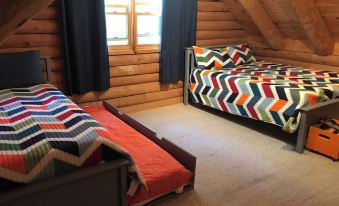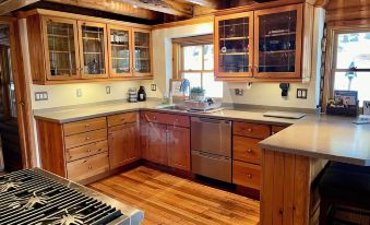 Step inside and enjoy the warm, rustic charm of this log cabin, featuring a spacious family room with vaulted ceilings, a cozy fireplace, and large windows that bring the outdoors in. The fully equipped kitchen has plenty of space to cook and gather, with modern appliances and a large dining table for sharing meals and memories.