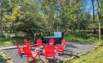 -Outside: Deck overlooking the scenic views and wildlife, fully private HOT TUB, fire pit with 8 Adirondack chairs, 1 ACRE fully private to disconnect and enjoy nature, driveway for up to 4 vehicles.