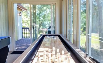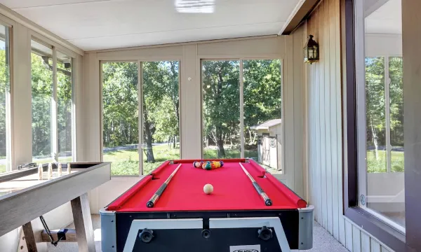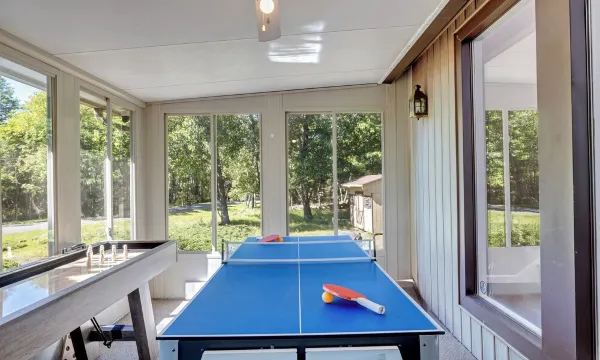 > The game/sunroom is ideal to have some fun, featuring a shuffleboard and a 3-in-1 Air Hockey, mini Ping Pong and mini Pool table.