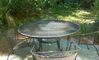 Out back, just off the bedroom door, is a nice concrete patio with a turquoise metal table and two matching chairs.
