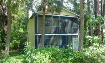 On the south facing wall is a beautiful ocean life mural designed and painted by world renowned artist Mary Jane Volkmann who was assisted by owner Cathy J. Sakas. On the front of the cottage under the eave just under the roof, the sassy Octopus watches over her Lair.