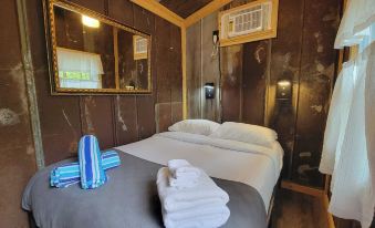 My boyfriend and i came for a weekend get away and it was for the most part great! But upon walking in the bathroom lights didnt work and the toilet kept running. The owner gave us a quick solution but the toilet didnt work properly the whole time we had to keep tapping the top of the box just to get it to quit running. There was also a broken bedside light and 1 battery in the remote for the tv so we werent able to utilize it. The discription was mildly veuge. We had packed a whole cooler full of food for the weekend and didnt realize there was a mini fridge coffee maker everything you need to be able to cook properly and store refridgerated foods.they also provided such a thin blanket for the cool night so definitely bring extra blankets! :) but overall the stay was amazing and exactaly what we were looking for