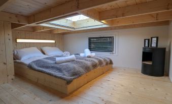 Velsen-Zuid 25 km from Amsterdam: Large, child friendly holiday development "EuroParcs Buitenhuizen", surrounded by trees and fields. Outside the resort, 6 km from the centre of Velsen-Zuid, 13 km from the sea, 13 km from the beach, 500 m from the river. For shared use: park, lawn for sunbathing, swimming pool heated (seasonal availability: 01.May. - 01.Oct.). Children's playground. In the complex: reception, WiFi, sauna (extra). Fitness room, steam room (extra). Infrared sauna, spa area (extra) table tennis, trampoline, bicycle rental. Central parking spaces. Supermarket 3 km, restaurant 7 km, bakery 3 km, sandy beach "IJmuiden" 13 km, park "Spaarnwoude" 2 km. Sports harbour 400 m, marina 13 km, golf course (18 hole) 15 km, surf school 13 km. Nearby attractions: Amsterdam 29 km, Haarlem 12 km, Keukenhof Lisse 36 km, Nationaal Park Zuid-Kennemerland 14 km, Snowplanet 3 km. Please note: entertainment in the season. Suitable for families. The owner does not accept any youth groups. Airfield 25 km from the property. The photograph shows a typical example. Additional accommodations can be booked. The holiday properties may differ in living space, floorplan, equipment and furnishing. "Tiny House 2", 1-room house 18 m2 on 2 levels. Bright, practical and wooden furniture furnishings: living/sleeping room with dining table, TV and heating stove. Kitchenette (dishwasher, kettle, freezer, electric coffee machine, combination microwave). Shower/WC. Upper floor: (steep stair) open gallery with 1 double bed. Heating. Small terrace. Terrace furniture. Facilities: Internet (WiFi, free). Please note: non-smokers only. The Tiny House shares with other Tiny Houses a courtyard with lounge sofas, hammocks and a (shared) hot tub (wood for heating can be bought at the reception). Bookings accepted for holiday purposes only. A deposit of 100 EUR per person can be charged on site. Instead of an enclosed bedroom, some sleeping areas are located in an open-plan area (gallery, alcove, etc.).