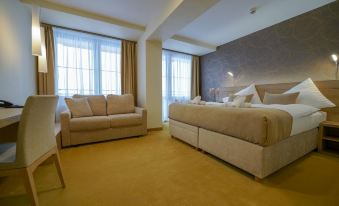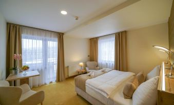 Newly reconstructed hotel with great wellness, food and even random sport activities. The rooms are not big, but very clean though. They have thay own basketball/footsall court, squash court, bowling. Court, billiard and ping pong are free for hotel guests. Every evening has a life piano music at the lobby bar. Staff is very friendly. There is also an EV charger at the parking lot.