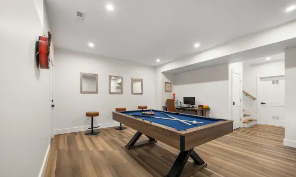 The basement floor of the house consists of an ergonomic work setup with desk, chair and monitor as well as a poll table (who does't like a break in between some work :)) The floor also has a bedroom and a full bath.